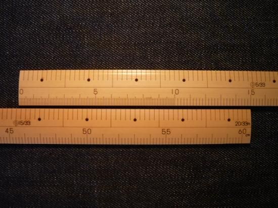 上側カネ尺、下側0〜10cmまで1mmそれ以降は2mm刻みで60cmまでの目盛となます。